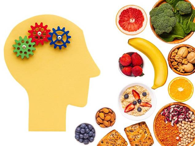 Alimentos saludables dispuestos junto a una silueta de cabeza con engranajes, simbolizando la conexión entre la nutrición y el bienestar mental.